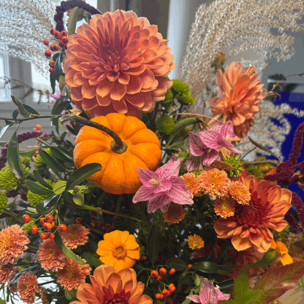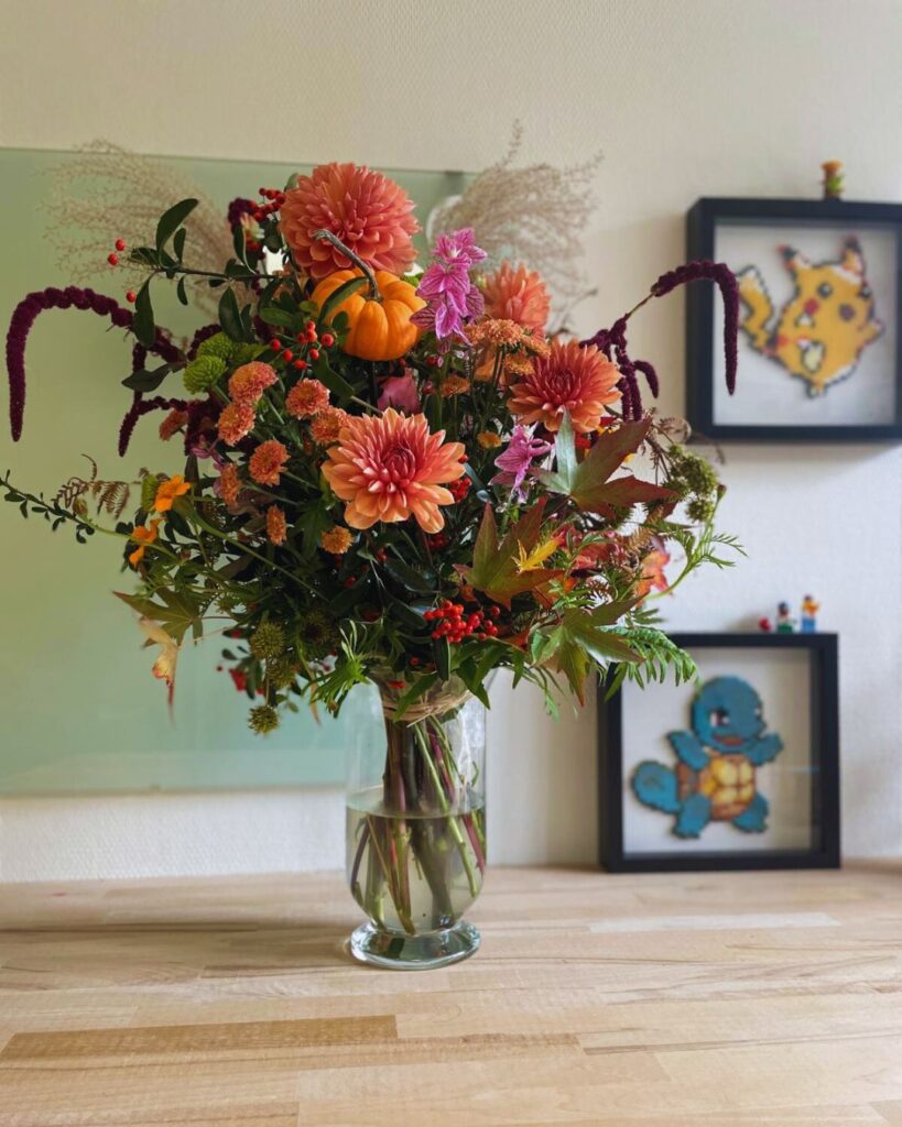 Et autant dire que toute l’équipe est ravie de cette composition, qui apporte un joli coup de pep’s dans les bureaux ! Des couleurs flamboyantes, des feuillages de saison, et même une mignonne coloquinte glissée au milieu de tout ça (coucou l’automne 🎃).